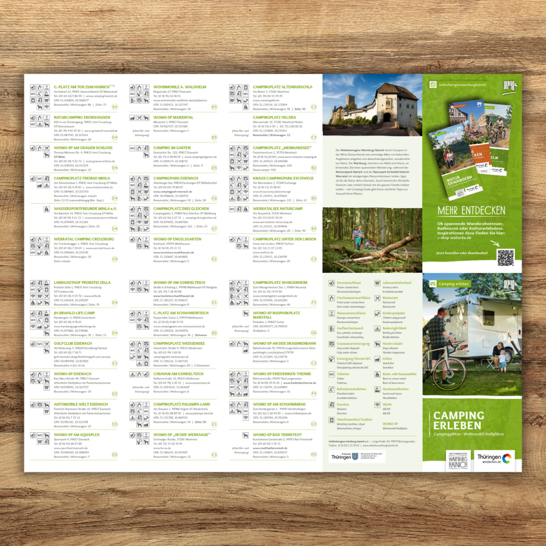 Die Broschüre gibt einen Überblick zu allen Camping- und Wohnmobilstellplätzen in der Welterberegion Wartburg Hainich.