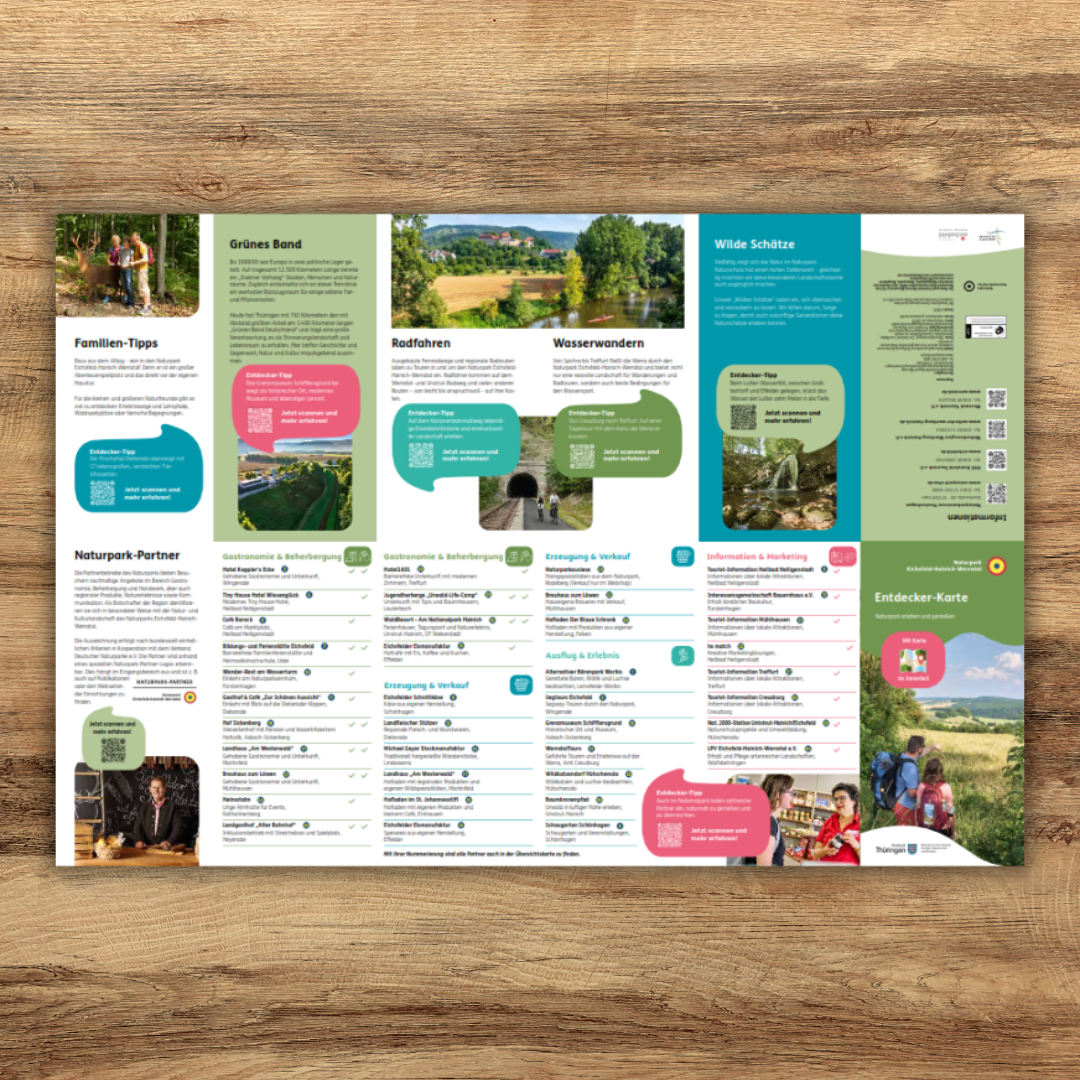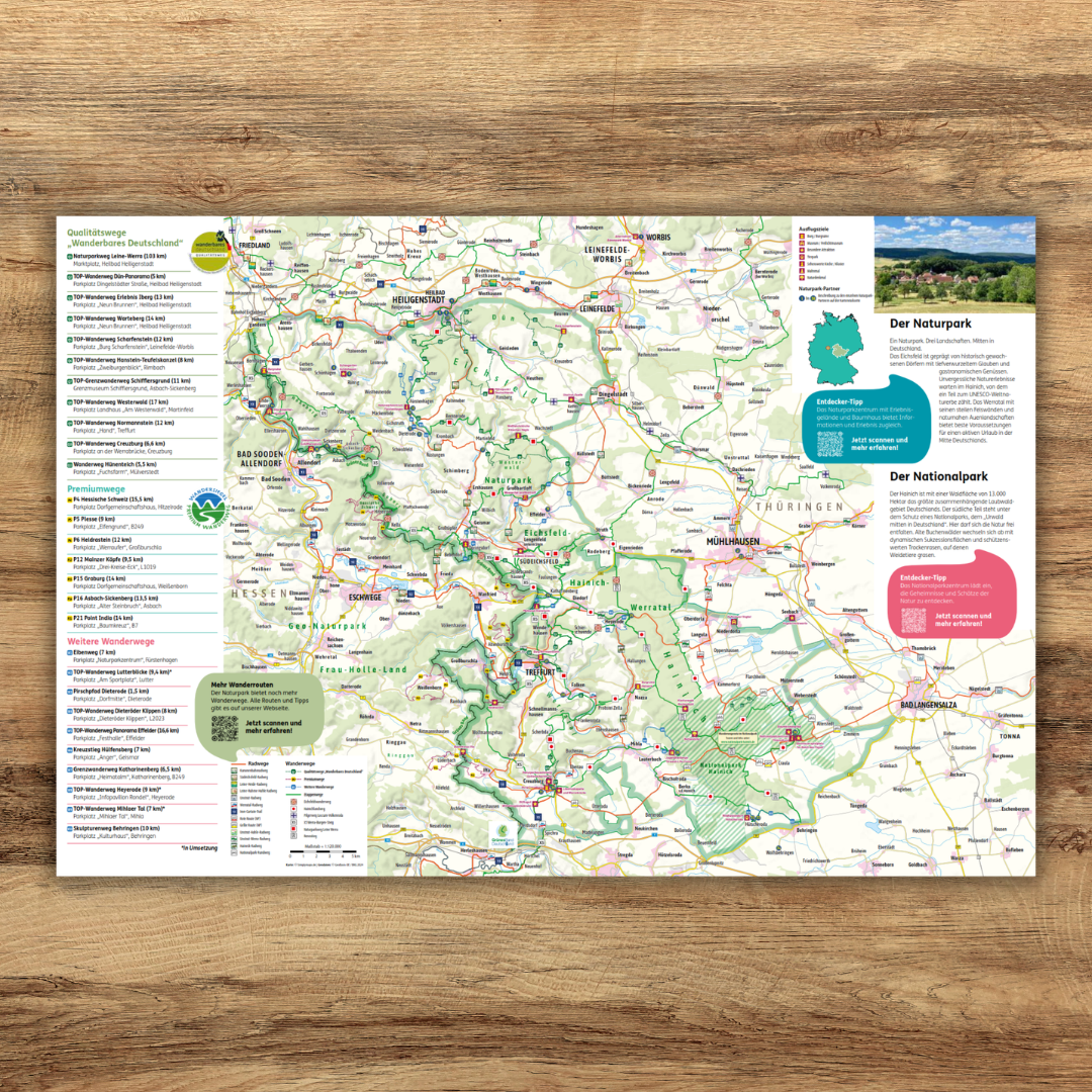 Ein Naturpark. Drei Landschaften. Mitten in Deutschland. Das Eichsfeld ist geprägt von historisch gewachsenen Dörfern. Unvergessliche Naturerlebnisse warten im Hainich, von dem ein Teil zum UNESCO-Weltnaturerbe zählt. Das Werratal mit seinen steilen Felswänden und naturnahen Auenlandschaften bietet beste Voraussetzungen für einen aktiven Urlaub.