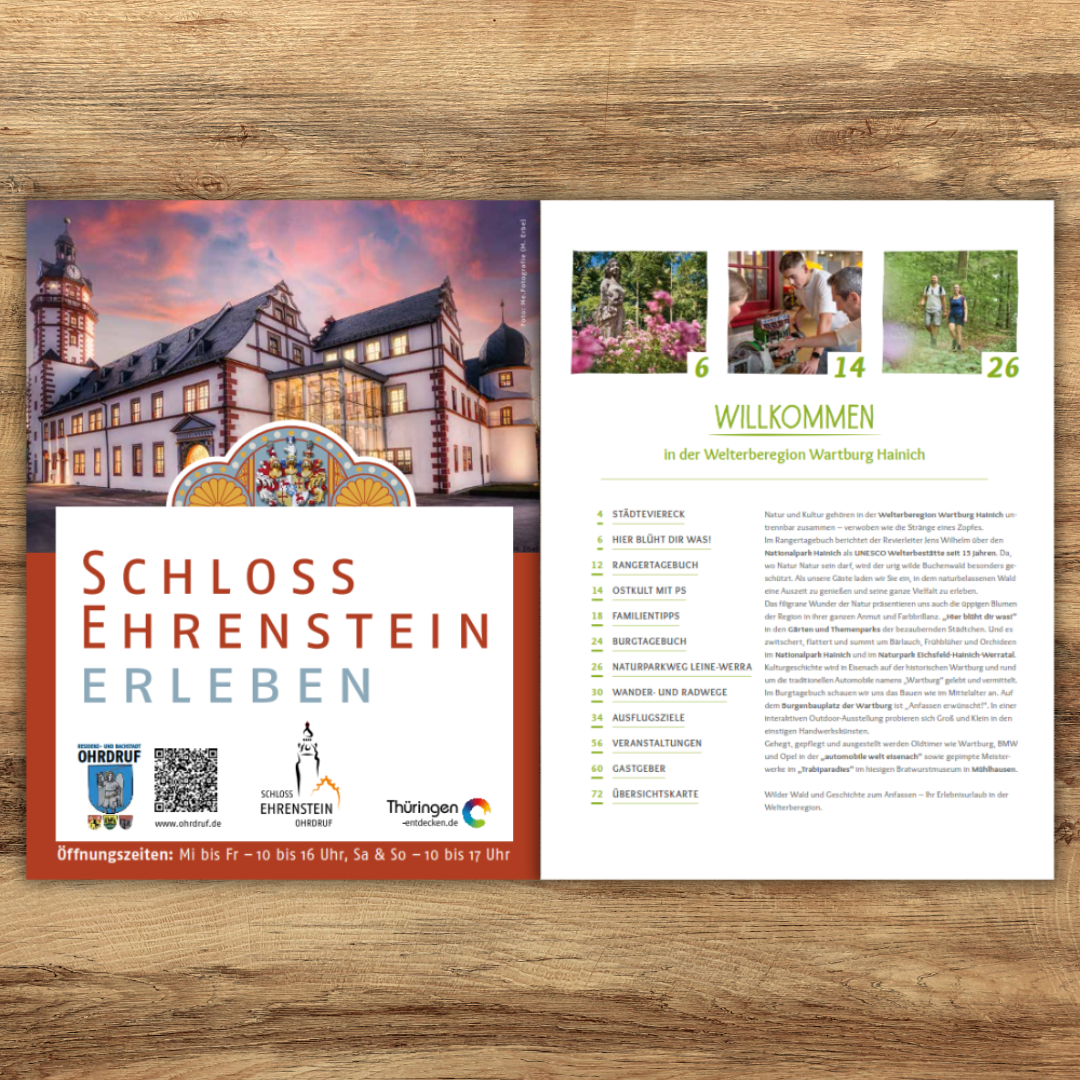 Das Erlebnismagazin bietet einen ersten und idealen Überblick zu Aktivitäten in der Region. Hier bekommen Sie viele Infos zur Welterberegion Wartburg Hainich und den besuchbaren Ausflugszielen. Es werden verschiedenen Wander- und Radwege vorgestellt sowie Einblicke in die Kultur- und Naturwelt gegeben.